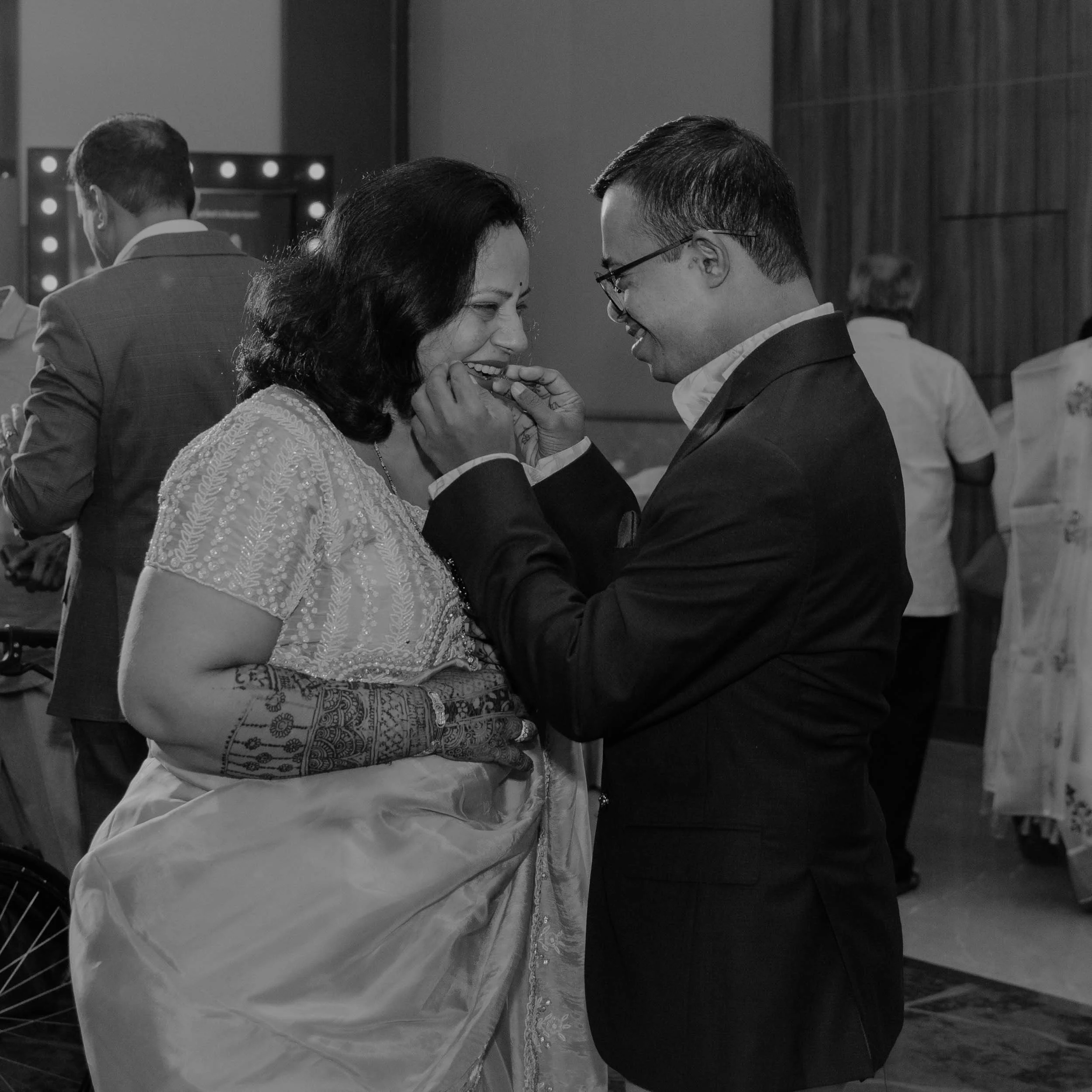A man in a suit is helping a woman in traditional attire put on a bindi on her forehead during a celebratory event.