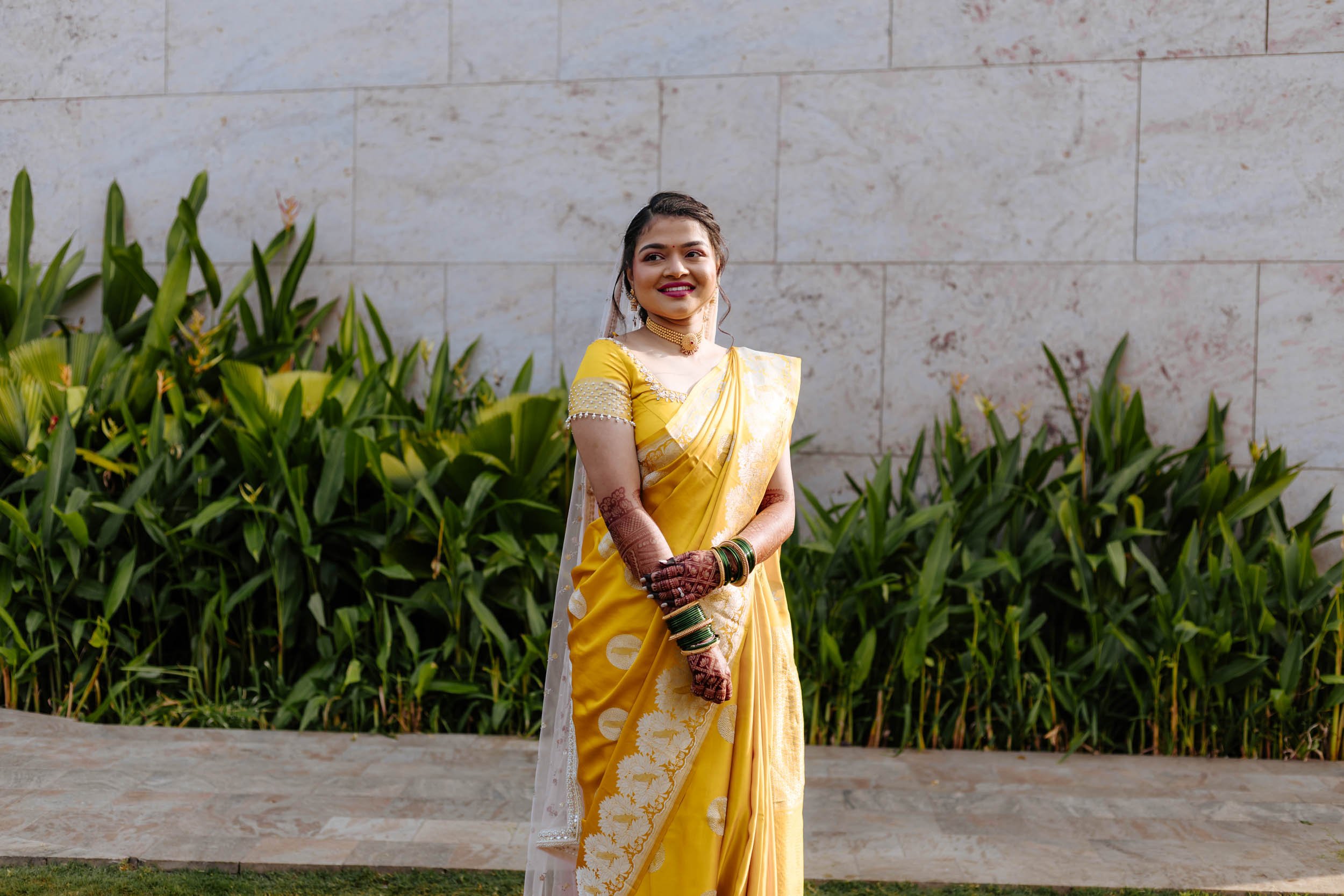 A woman dressed in a yellow saree with traditional jewelry and mehndi on her hands, standing outdoors against a green plant and stone wall background.