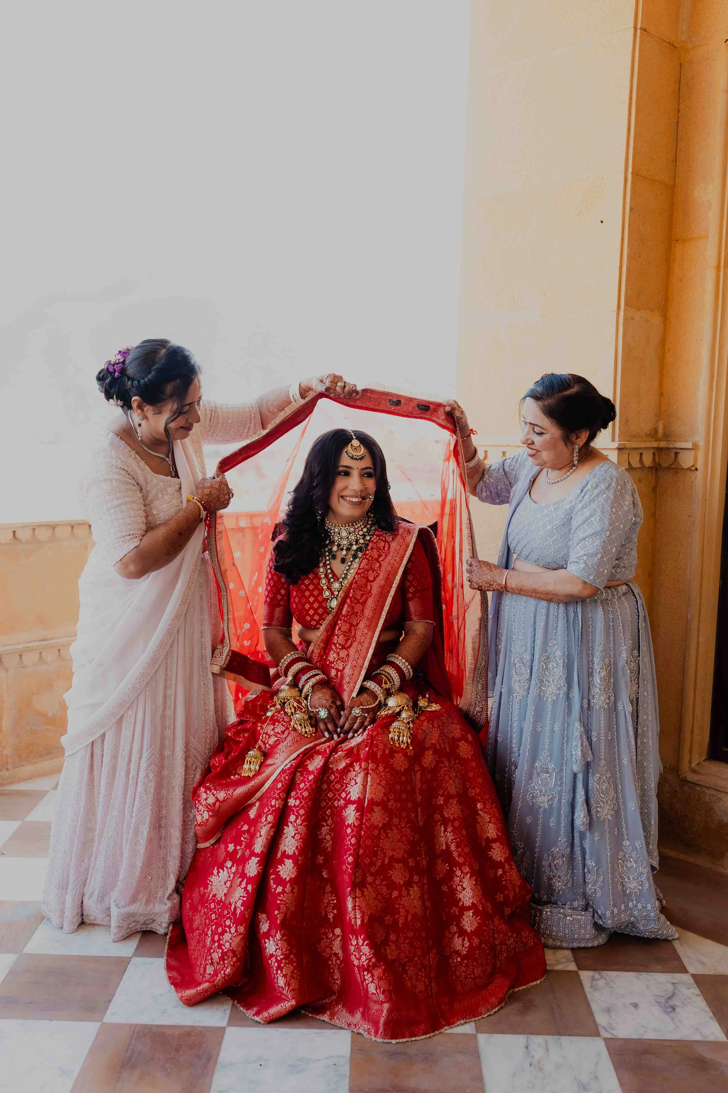 A bride dressed in traditional red and gold Indian attire, sitting and being adorned with jewelry, with two women on either side helping her.
