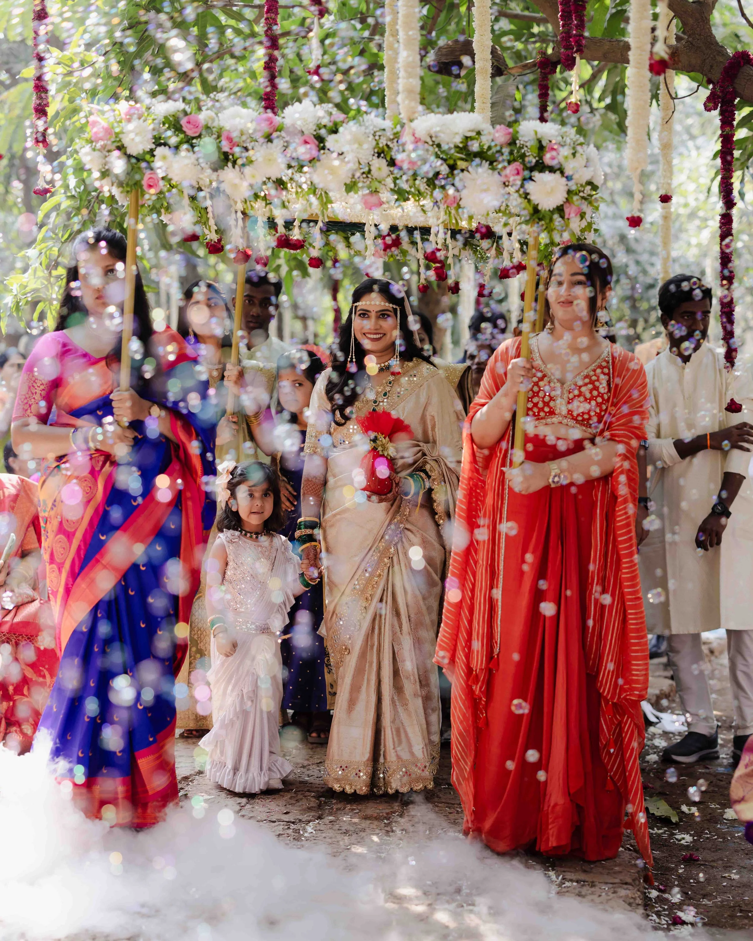 A group of women and children at an outdoor Indian wedding celebration, under a floral canopy decorated with pink and white flowers, with colorful sparkles and bubbles in the air.